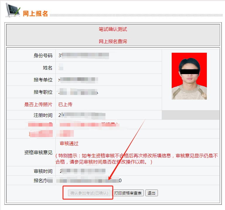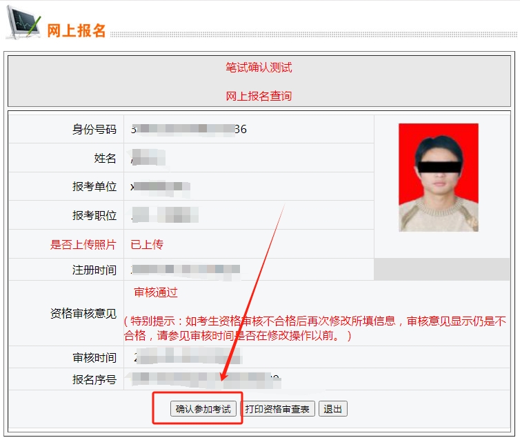 2、点击下方“确认参加考试”按钮完成确认,未确认的考生视为放弃参加笔试。