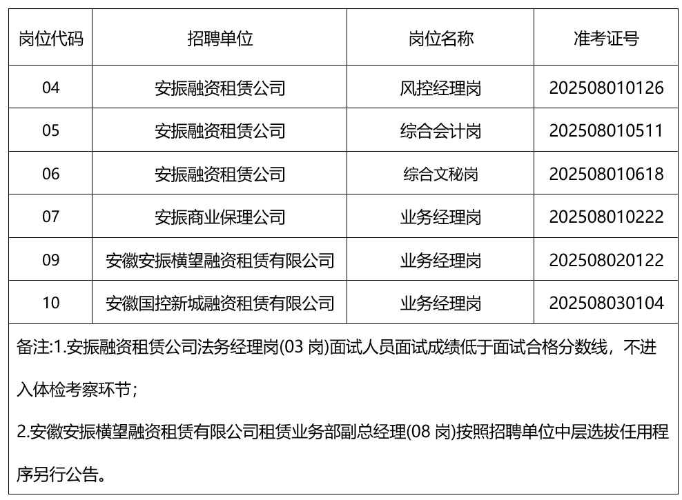 后续体检、考察事项将进行电话通知,请保持通讯畅通。 咨询电话:0551-62855538王经理 咨询时间:工作日8:30-12:00、14:30-17:30 安徽省人力资源有限公司 2025年8月19日