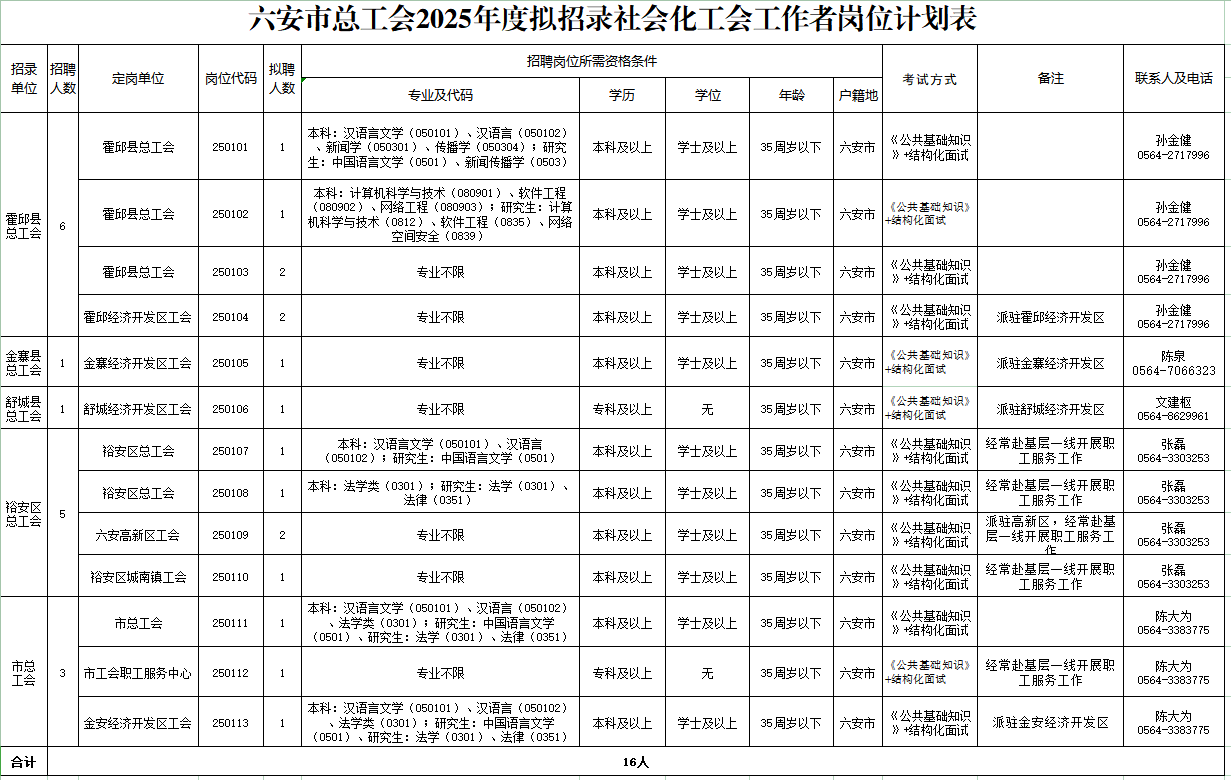 本次计划招聘16名社会化工会工作者:霍邱县总工会6人;金寨县总工会1人;舒城县总工会1人;裕安区总工会5人;市总工会3人。招聘公告在六安市人事考试信息网(www.lapta.cn)、六安市总工会官网(www.laszgh.org)统一发布。具体招聘岗位、条件等详见附件1。