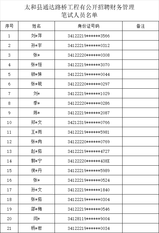 普众互联网上报名系统根据《太和县通达路桥工程有限责任公司公开招聘财务管理人员公告》以及报名确认等情况,现将笔试有关事项公告如下: