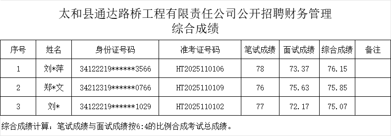 太和县通达路桥工程有限责任公司公开招聘财务管理人员综合成绩公示