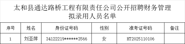 附件:2025年太和县通达路桥工程有限责任公司公开招聘拟聘用人员名单