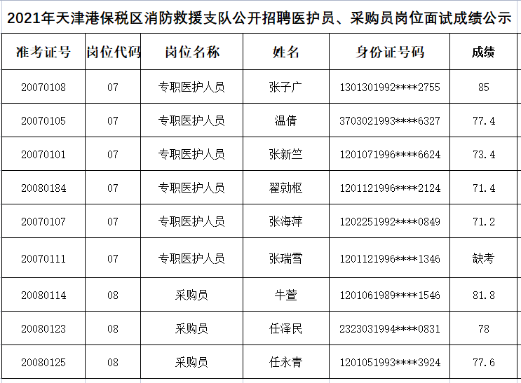 2021年天津港保税区消防救援支队公开招聘医护员、采购员岗位面试成绩公示
